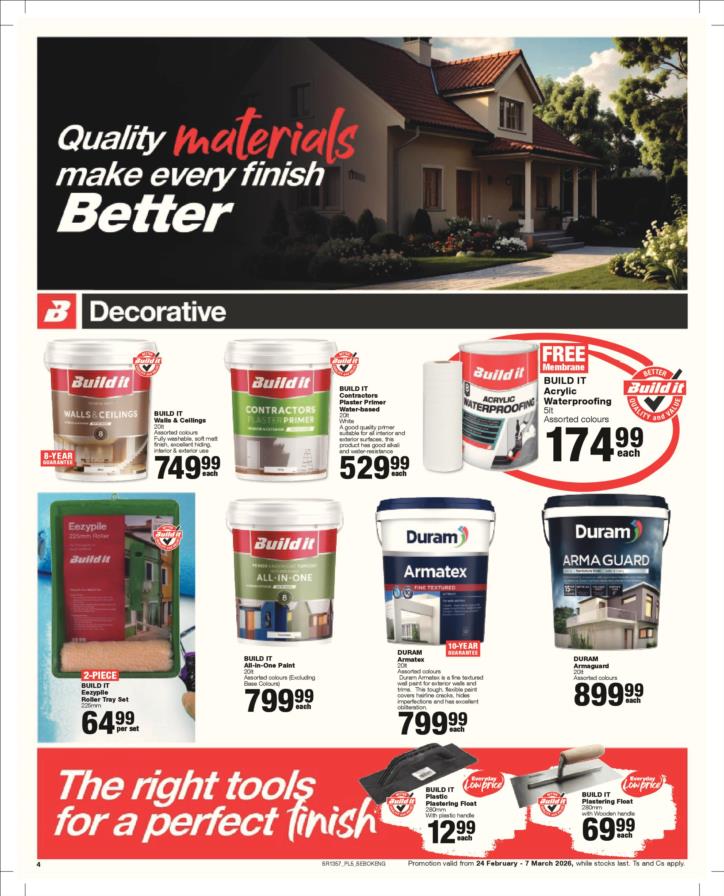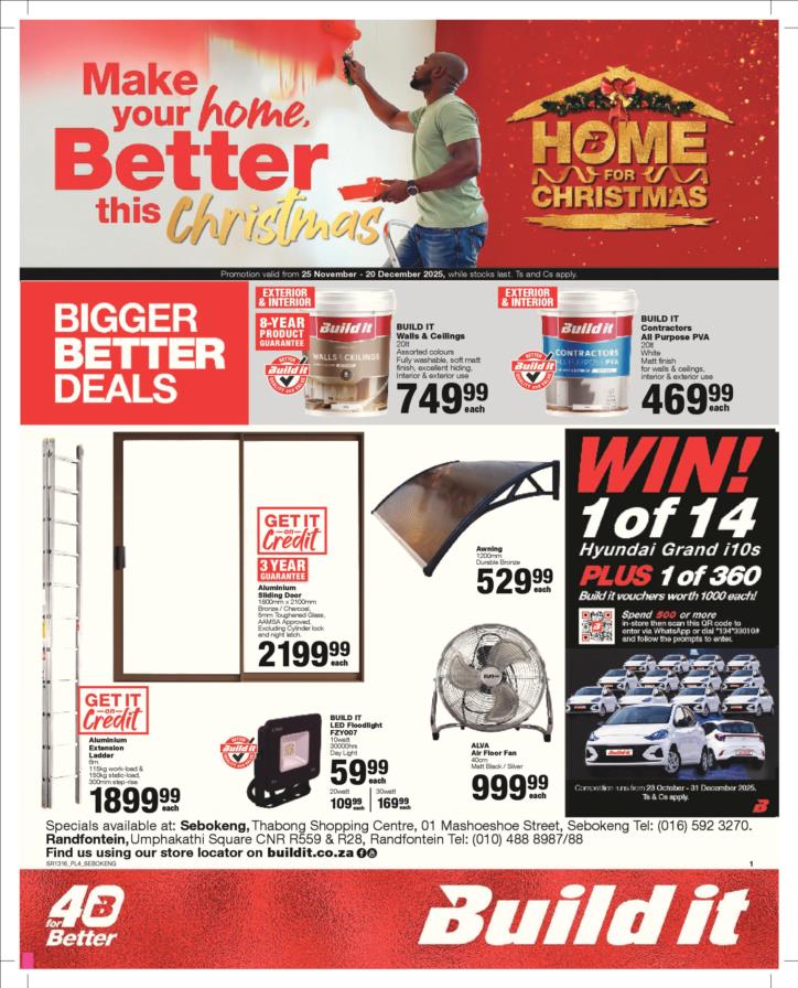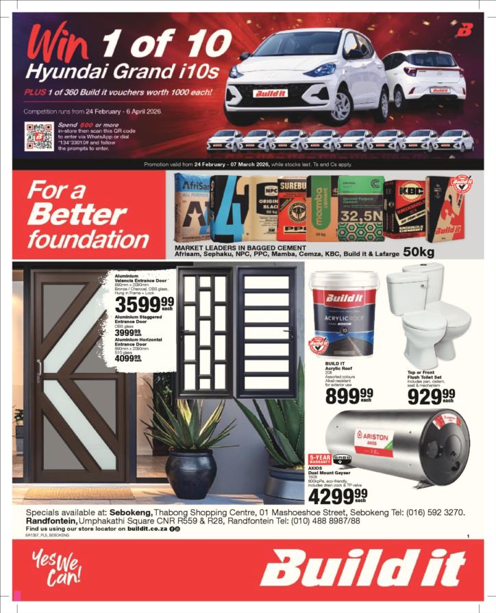 With our core values of Family, Entrepreneurship and Passion being at the heart of everything we do, the Build it group of over 390 stores across Southern Africa has been supplying quality building materials and serving our communities for more than 35 years.Each of our stores is deeply involved in the communities they serve and we believe in giving back to the communities that support us. One of the ways we do this is through initiatives such as our ongoing sponsorship of Under 13 Soccer development in Southern Africa - the youth are our future and by nurturing a healthy lifestyle through sport, we are building a better future for us all.For us at Build it, it’s become about more than just making home building simple. We’re on a mission possible – to turn “no” into “yes”, “can’t’ into “can” and our customers’ dreams into plans! That’s why we’ve adopted a spirit of positivity, a can-do attitude, a powerful essence and a culture that we live by… YES WE CAN!So when customers ask if we can provide the best service, a great range and excellent advice, our answer is always and without doubt…YES WE CAN!