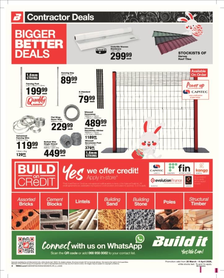 With our core values of Family, Entrepreneurship and Passion being at the heart of everything we do, the Build it group of over 390 stores across Southern Africa has been supplying quality building materials and serving our communities for more than 35 years.Each of our stores is deeply involved in the communities they serve and we believe in giving back to the communities that support us. One of the ways we do this is through initiatives such as our ongoing sponsorship of Under 13 Soccer development in Southern Africa - the youth are our future and by nurturing a healthy lifestyle through sport, we are building a better future for us all.For us at Build it, it’s become about more than just making home building simple. We’re on a mission possible – to turn “no” into “yes”, “can’t’ into “can” and our customers’ dreams into plans! That’s why we’ve adopted a spirit of positivity, a can-do attitude, a powerful essence and a culture that we live by… YES WE CAN!So when customers ask if we can provide the best service, a great range and excellent advice, our answer is always and without doubt…YES WE CAN!