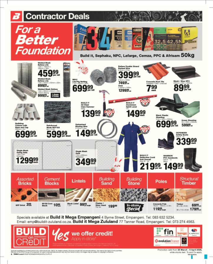 With our core values of Family, Entrepreneurship and Passion being at the heart of everything we do, the Build it group of over 390 stores across Southern Africa has been supplying quality building materials and serving our communities for more than 35 years.Each of our stores is deeply involved in the communities they serve and we believe in giving back to the communities that support us. One of the ways we do this is through initiatives such as our ongoing sponsorship of Under 13 Soccer development in Southern Africa - the youth are our future and by nurturing a healthy lifestyle through sport, we are building a better future for us all.For us at Build it, it’s become about more than just making home building simple. We’re on a mission possible – to turn “no” into “yes”, “can’t’ into “can” and our customers’ dreams into plans! That’s why we’ve adopted a spirit of positivity, a can-do attitude, a powerful essence and a culture that we live by… YES WE CAN!So when customers ask if we can provide the best service, a great range and excellent advice, our answer is always and without doubt…YES WE CAN!